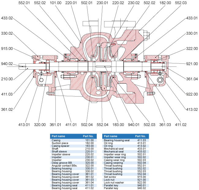 Between bearings, two-stage, Back-to-back impellers, single or double suction, radially split centerline supported casing, horizontal centrifugal pump to API610, 11th.