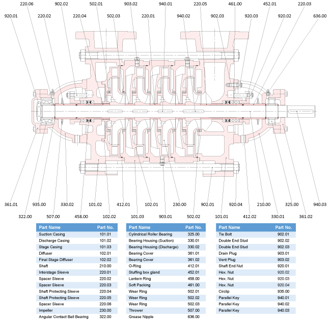 Single or multi-stage, ring section, radially split (suction, discharge and stage) casings, between-bearings, foot mounted, horizontal high centrifugal pumps to EN 22 858/ISO 2858/ISO 5199.